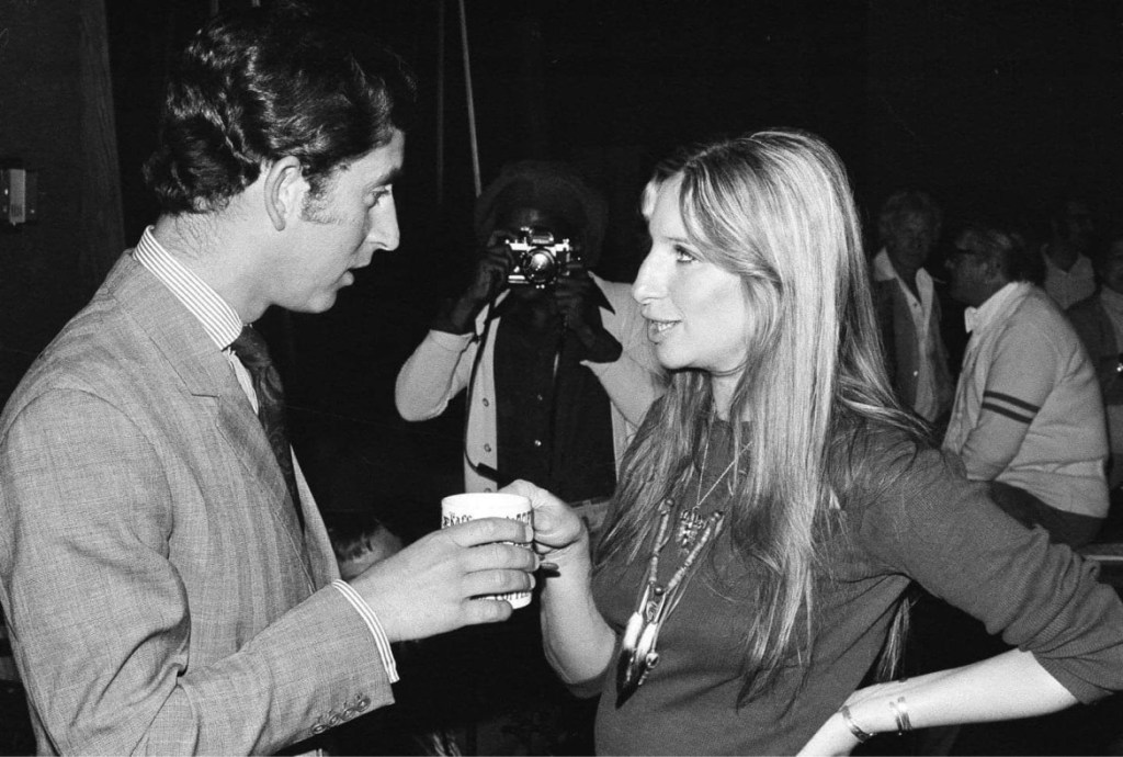 Barbra Streisand offers a cup of coffee to Prince Charles as they chat on a set at Warner Bros. studio in Los Angeles on March 19, 1974. The Prince is visiting Southern California while his ship is docked in San Diego. (DFS/Associated Press)