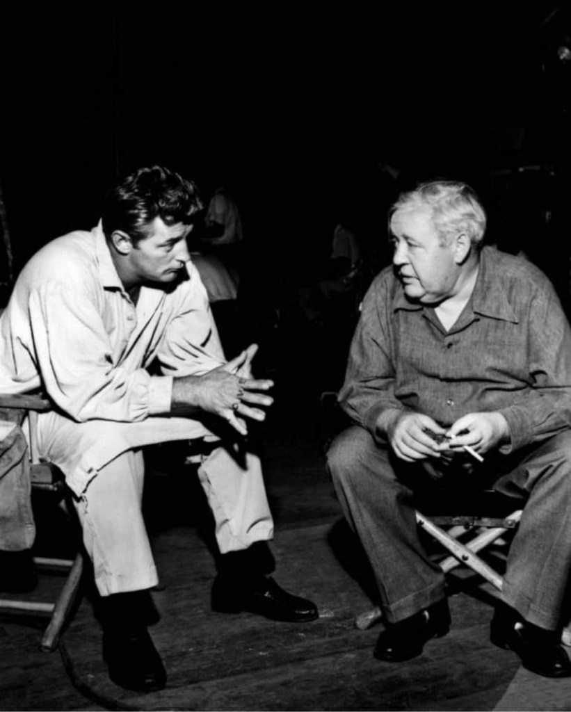Robert Mitchum with director Charles Laughton on the set of The Night of the Hunter – 1955.