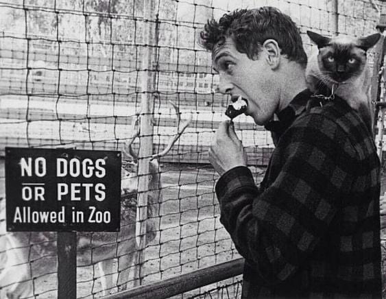 Paul Newman eating ice cream with a cat on his shoulder, 1956. (Photo: Sanford Roth)