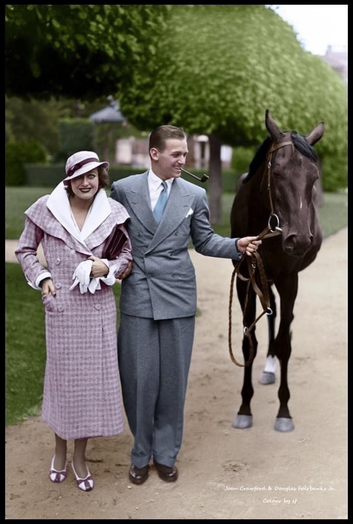 Joan Crawford with husband Douglas Fairbanks, Jr in 1932 in Chantilly, France. (Colorized). Photo by Gamma-Keystone via Getty Images.