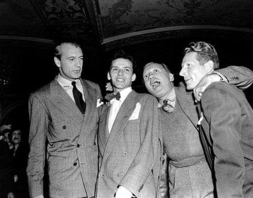Gary Cooper, Frank Sinatra, Jack Benny, and Danny Kaye at a cocktail party at the Beverly Wilshire Hotel in Los Angeles, 1945 (AP Photo)