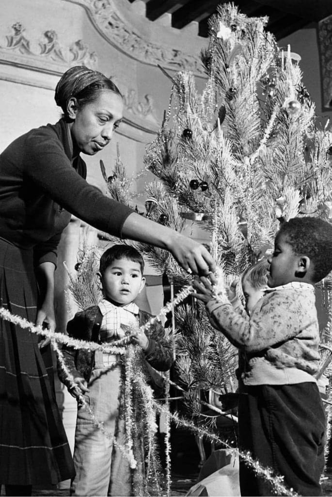 The famed entertainer trims her tree with her children in her French chateau. Josephine Baker and her husband, Jo Bouillon, adopted 12 children together and lived in a countryside residence called Les Milandes.